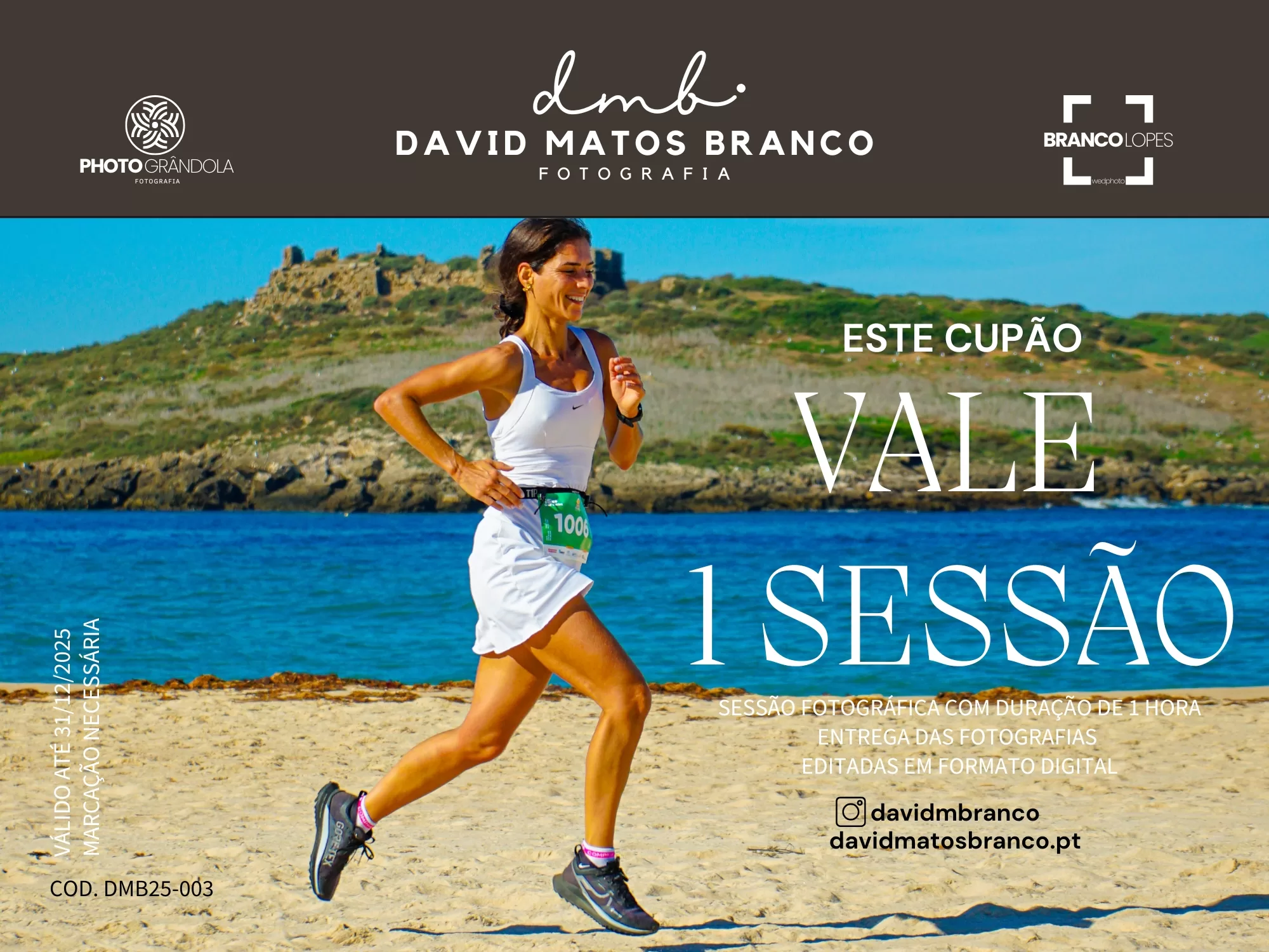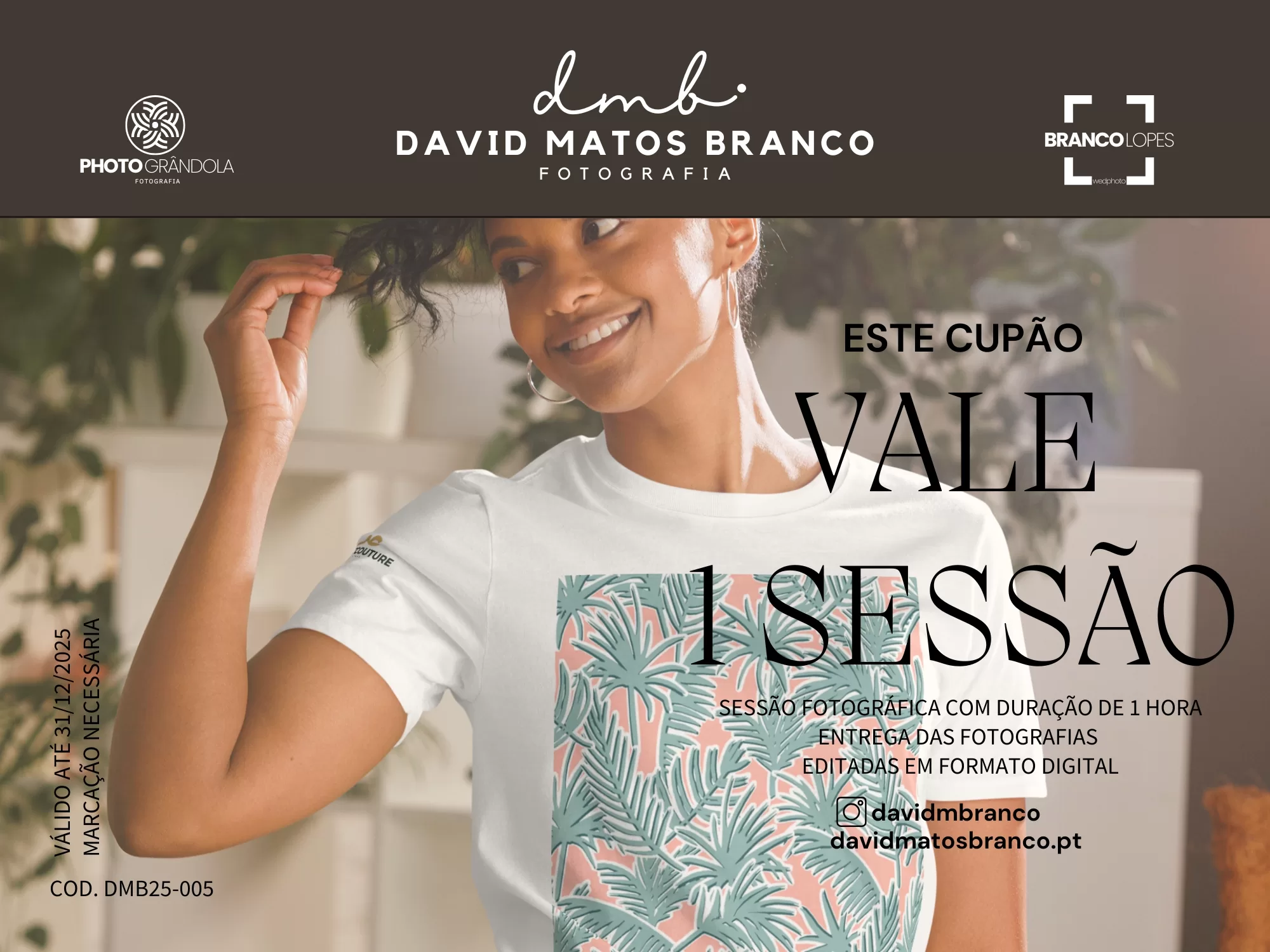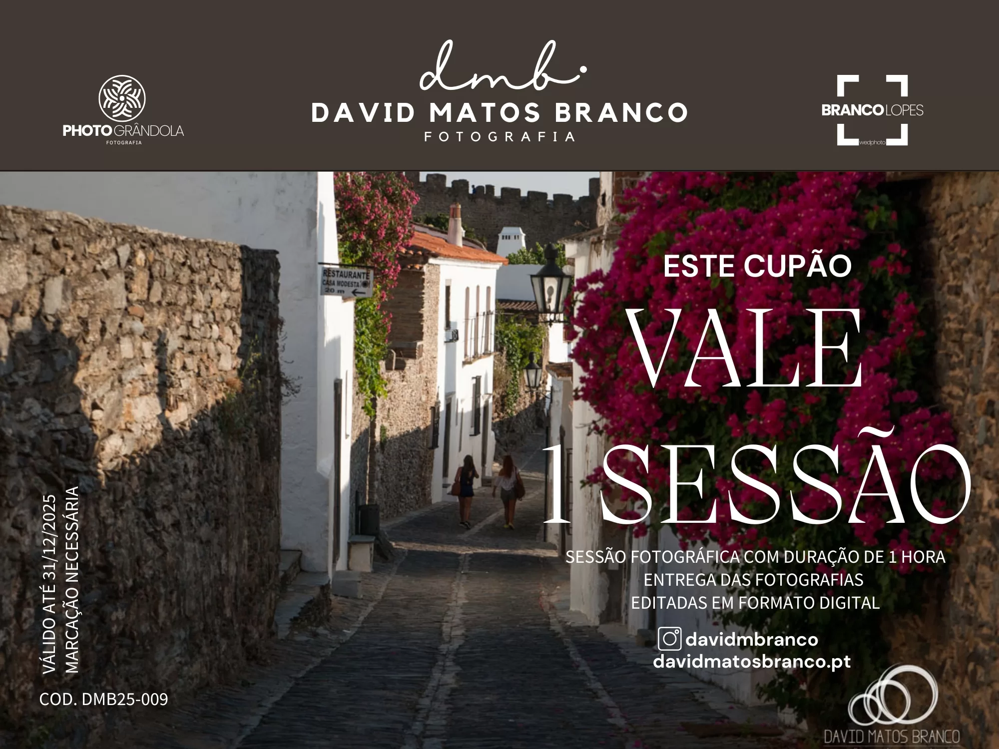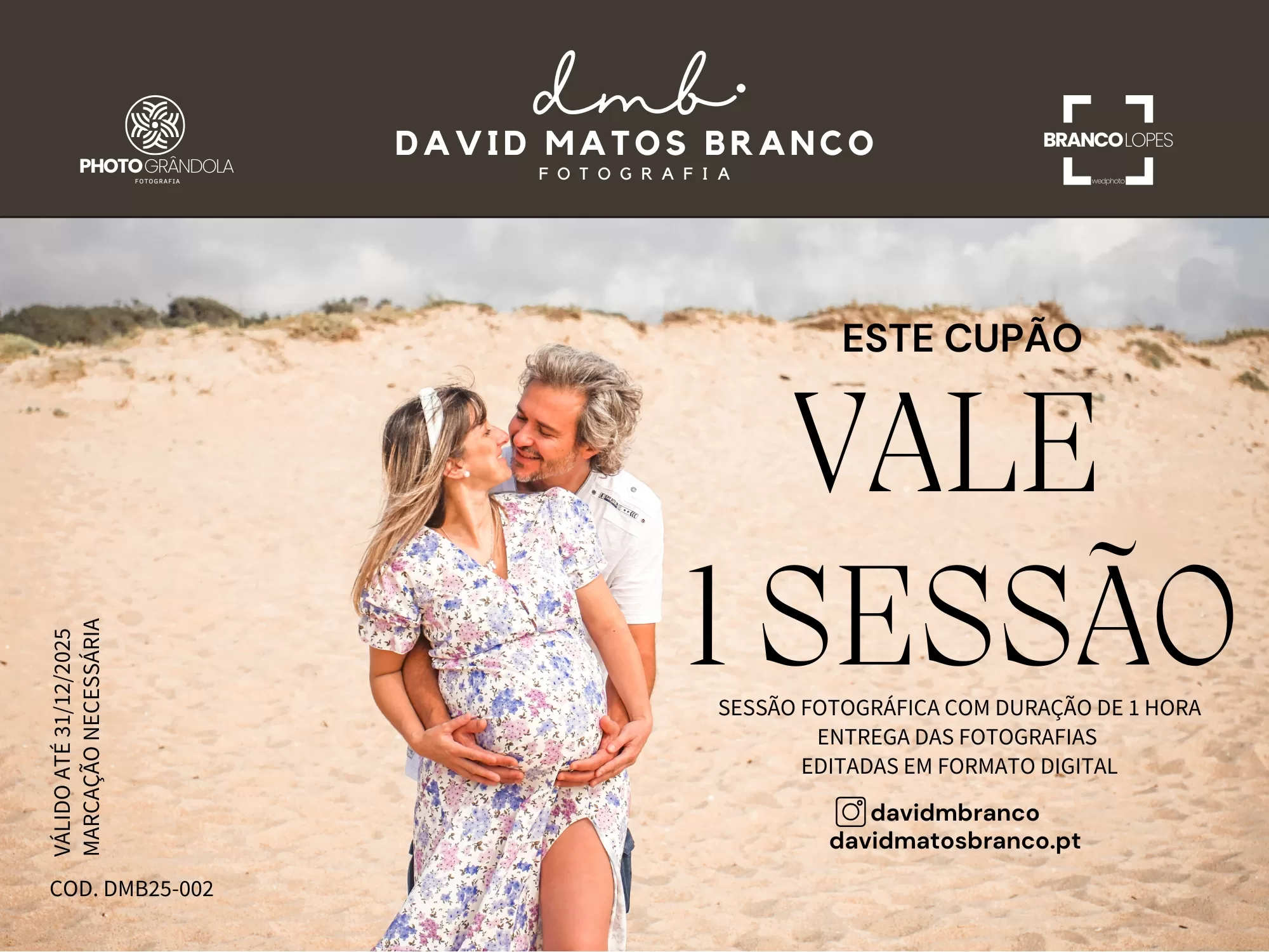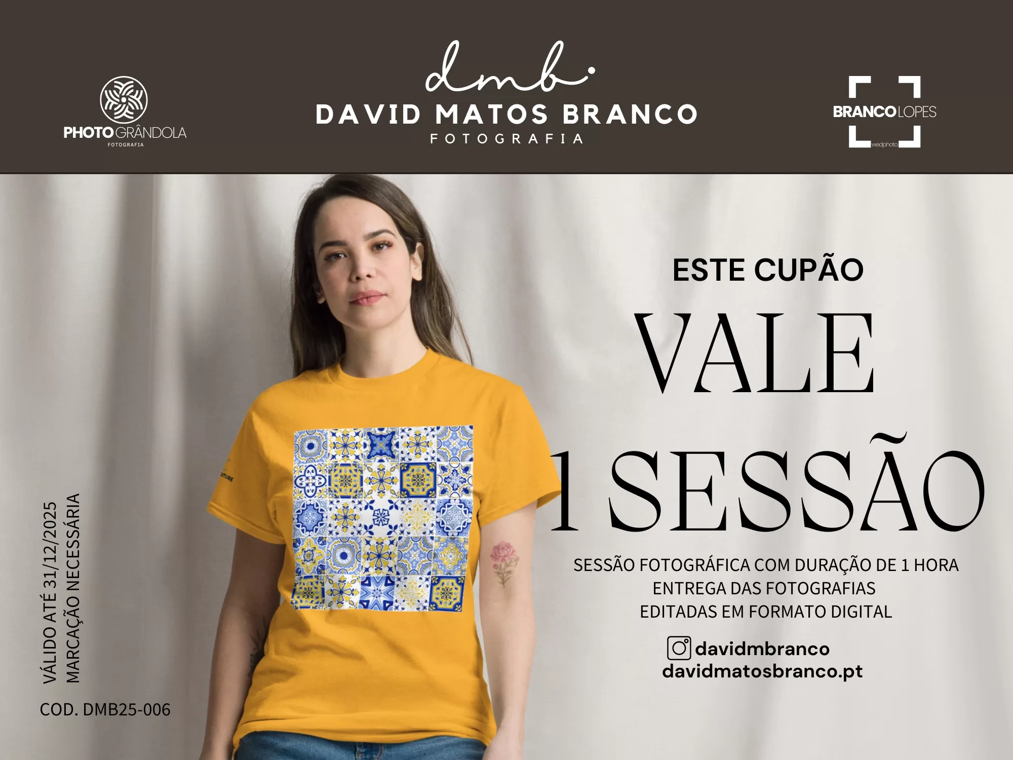 Válida por todo o ano de 2025, a Sessão Fotográfica com os fotógrafos David Matos Branco e Joana Lopes pode ser realizada em qualquer data, mediante marcação.